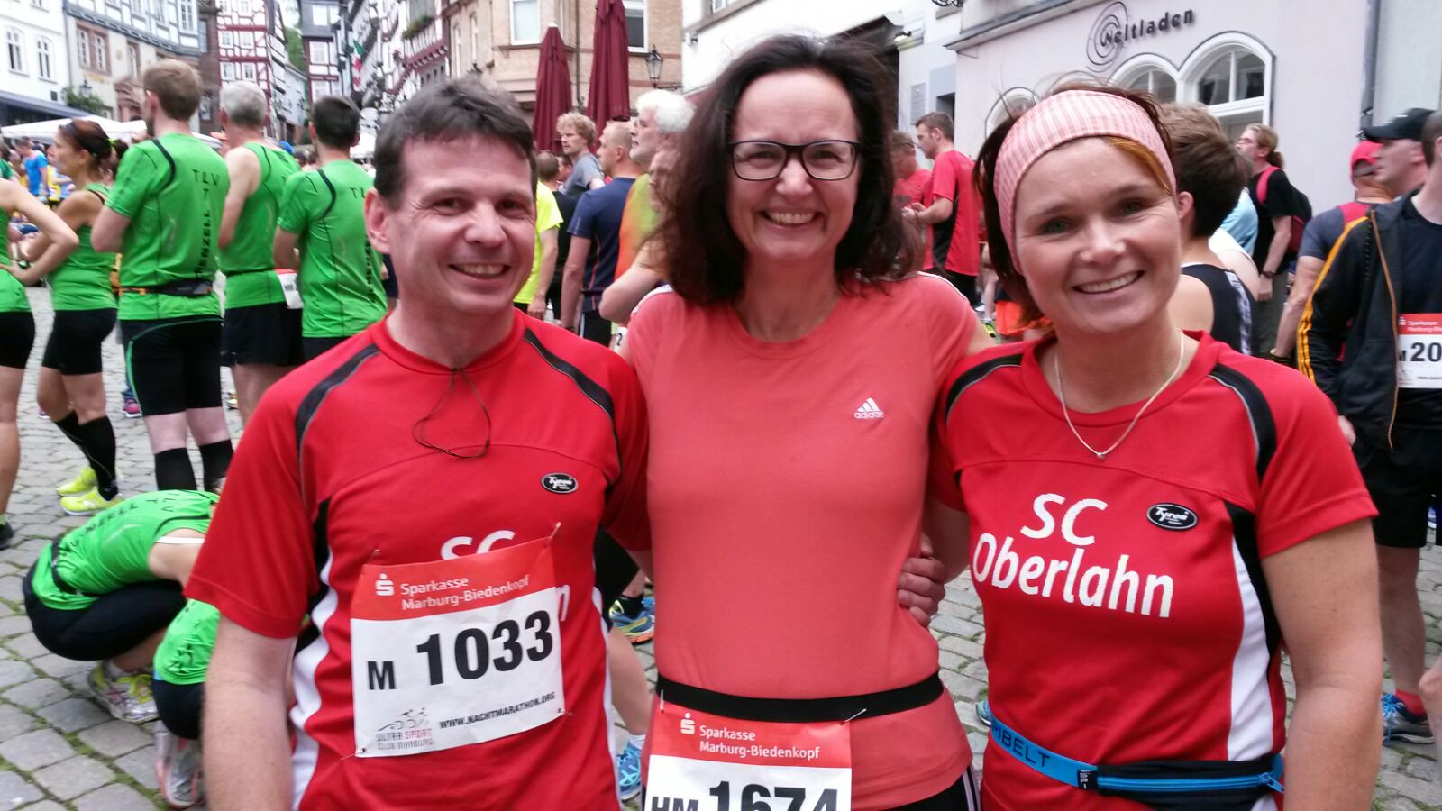 Gute Laune vor dem Start am historischen Marktplatz in Marburg: Jörg Geis, Andrea Dietrich und Katja Schmidt