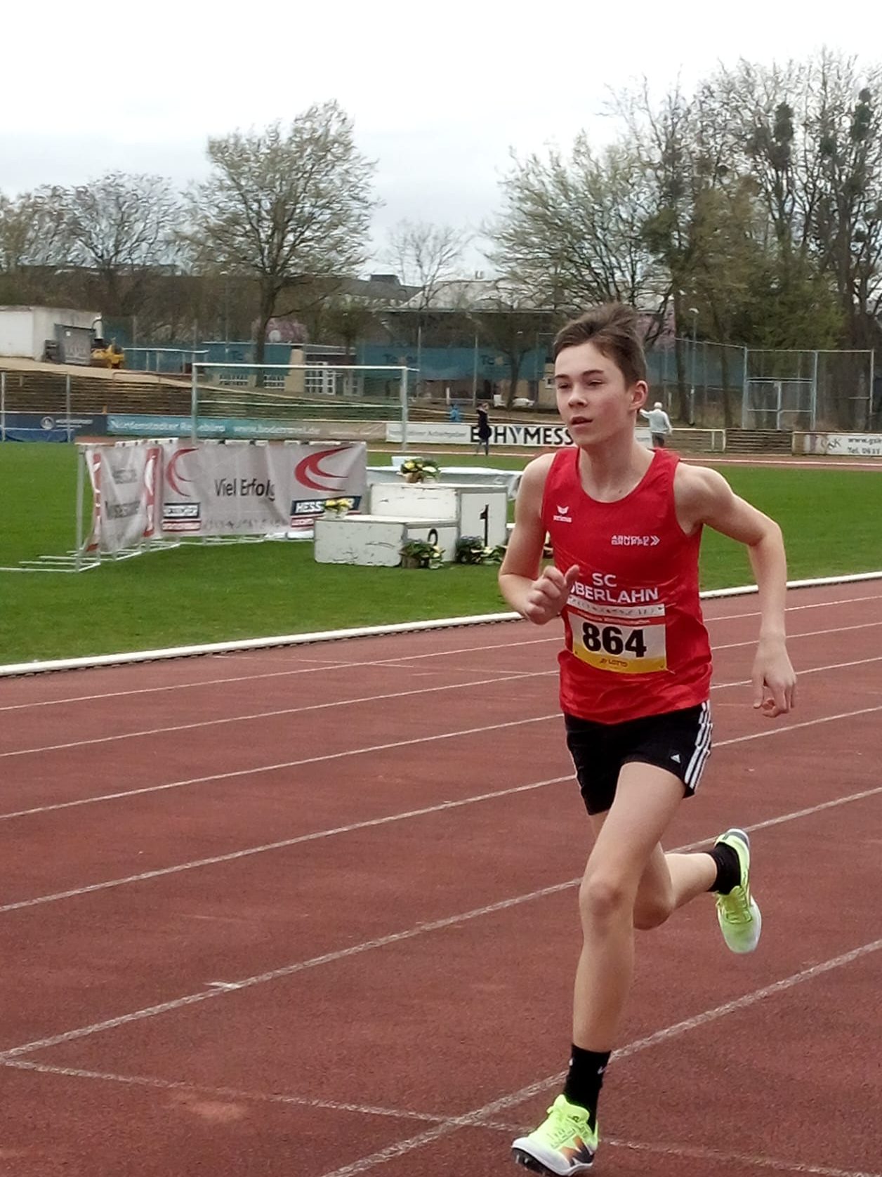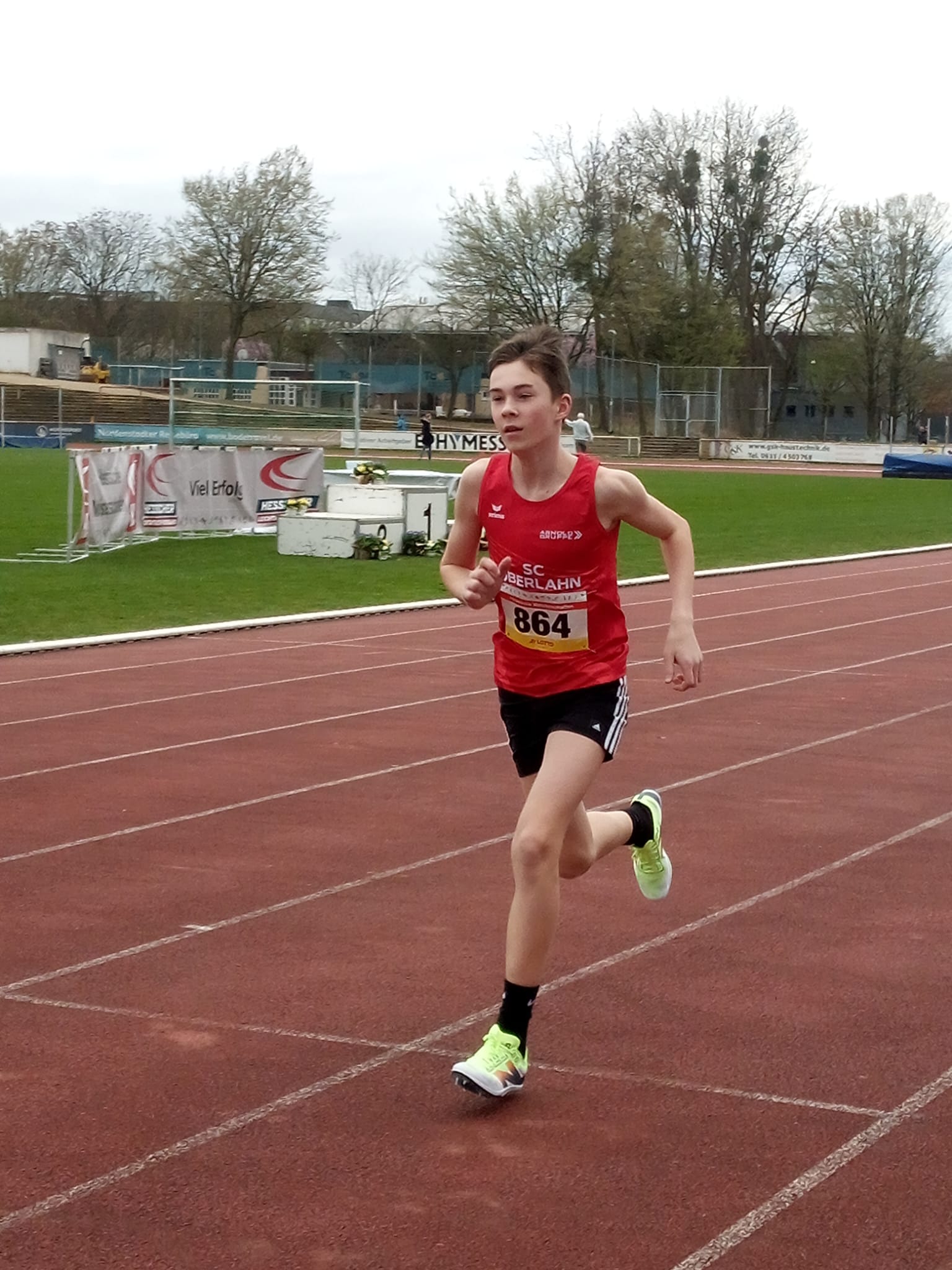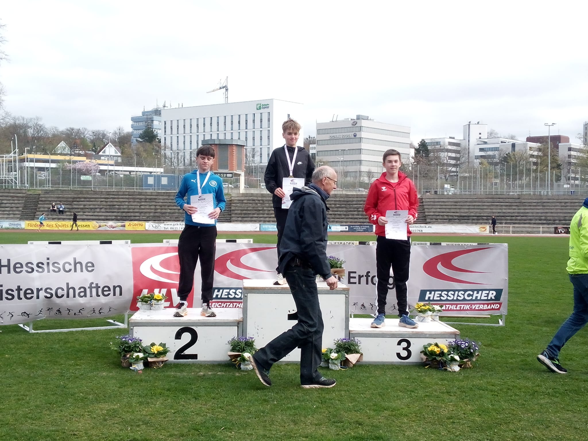 Bei der hessischen Langstrecke in Wiesbaden gewinnt Konstantin sensationell die Bronzemedaille in der m 14 auf der 3000 m Strecke. Nach einem gut gelungen Start und Eingruppierung in der 1. Verfolgergruppe, konnte er sich im Laufe des Rennens gemeinsam mit einem Hanauer Athleten etwas absetzen. Abwechselnd wird Tempoarbeit gemacht. Zu Beginn der letzten Runde konnte Konstantin das Tempo nochmals steigern, sodass er sich nochmal deutlich absetzen konnte. Am Ende blieb die Uhr bei 10:19,44 stehen, über 30 Sekunden schneller als seine aktuelle Bestleistung. Der Lohn für sein beherztes Rennen war der 3. Platz.